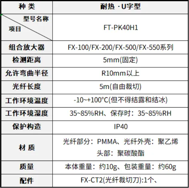 免校准+ 易安装,效率直接拉满 不同于传统传感器需要反复校准光轴的麻烦操作,FT-PK40H1 采用 U 字形状设计,投光部和受光部一体成型,安装时根本不用费心对准光轴,上手就能用。5m 长的光纤支持自由裁切,根据现场需求灵活调整长度,搭配 R10mm 以上的允许弯曲半径,狭小空间也能轻松适配,让安装工作又快又省心。 靠谱配置,稳定检测不翻车 核心性能绝不妥协!固定5mm 的检测距离,能精准捕捉阀门开关、端口升降等定位需求;IP40 的保护构造,搭配 PMMA 光纤材质和聚碳酸酯头部,耐磨耐造不易损坏。工作环境温度覆盖 - 10~+100℃(干燥状态),即使在 35~85% RH 的湿度环境下也能稳定运行,全方位保障生产检测的连续性。
