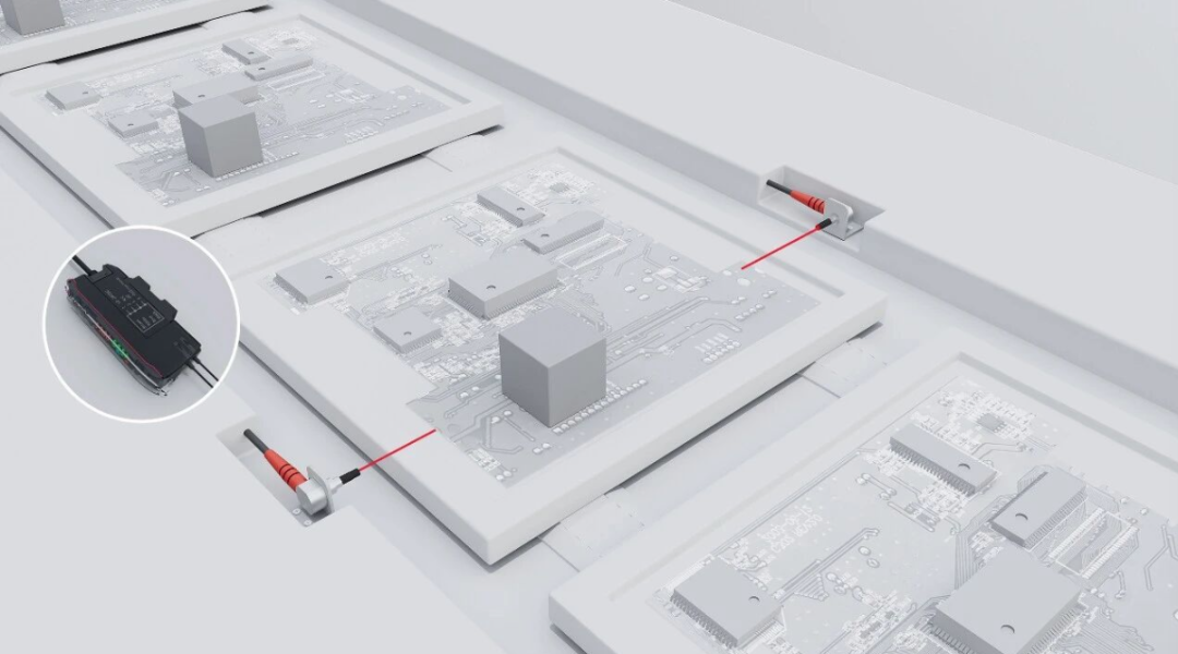 生产要求:SMT贴片线或插件线上,PCBA板(印刷电路板)跑得特别快,板上元器件高低不一,安装空间特别紧凑。而且生产线周围全是变频器、伺服电机,电磁干扰特别强,普通传感器要么被干扰误报,要么装不进去,很容易导致整线停机。 解决方案:用对射式直角光纤,能灵活检测电容、芯片等各种元器件。响应时间可以在40微秒到16毫秒之间调节,既能适应紧凑的安装空间,又能跟上高速生产节奏,漏检误检率直接降下来。 体外诊断(IVD)行业:机械手抓试管不“抓空”