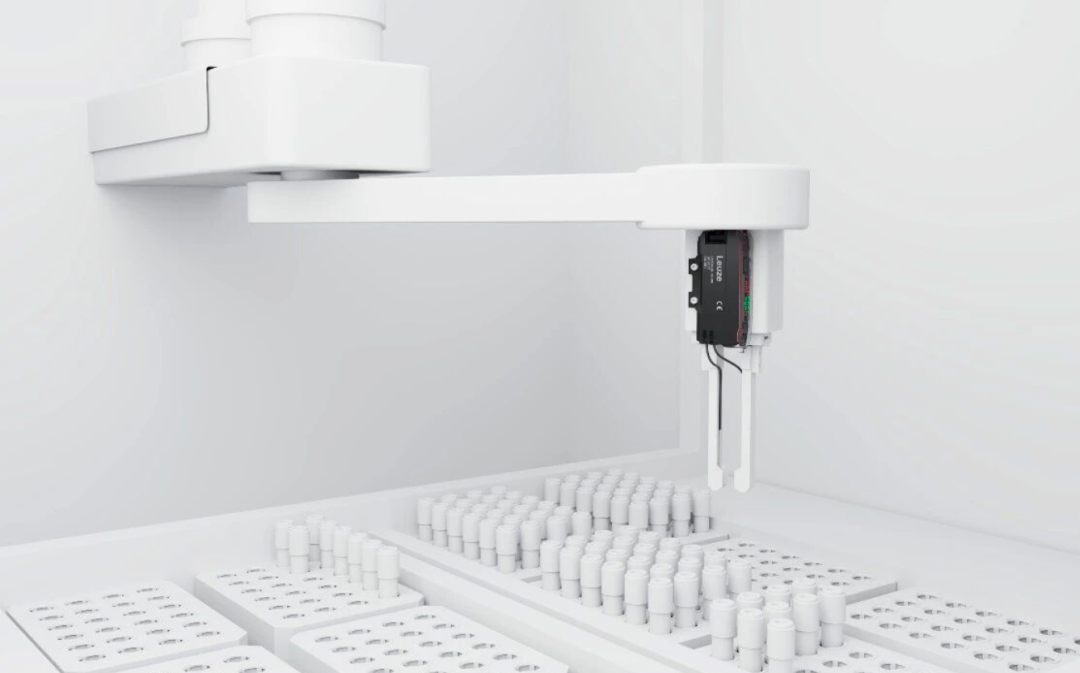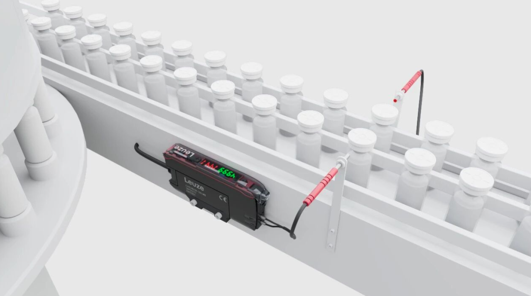 医疗要求:全自动化学发光免疫分析仪里,机械手要从试管架上抓采样试管。一旦抓空,不仅浪费时间,还可能搞乱样本顺序,造成严重的医疗差错。所以必须要100%可靠检测透明或半透明试管,还不能污染样本。 解决方案:劳易测专门优化了针对透明物体的光纤传感器,能敏锐捕捉到透明玻璃瓶身的细微反差,检测特别稳,不会误报漏报。它的差分模式还能智能过滤机械手抖动带来的干扰信号(脉冲持续时长可以调),毫秒级响应速度和高速机械手完美配合。 制药行业:透明西林瓶检测零失误