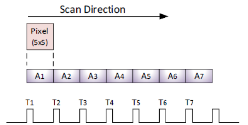 重叠示意图 如图所示,当您在相同放大倍率下应用相同行速率时,区域A2、A3…会在不同的行之间重叠。这就是图像模糊的原因。要在相同行速率下获得正确图像,请将放大倍率提高到2×M。