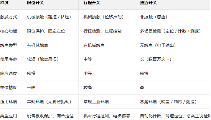 接近开关的性能优势十分突出:首先是工作可靠,由于没有机械触点,避免了触点磨损、氧化、粘连等问题,大大提高了开关的稳定性和使用寿命,其使用寿命通常可达数百万次甚至数千万次,远超机械触点式的行程开关和限位开关;其次是响应速度快,操作频率高,能够适应高速运动物体的检测需求,比如在高速输送线上对物料的计数和定位;再者是复定位精度高,检测距离精准可控,误差小,适合对定位精度要求较高的自动化设备;此外,接近开关还具有功耗低、抗干扰能力强、适应恶劣工作环境等特点,能够在粉尘、油污、潮湿、振动等恶劣条件下稳定工作,这也是其在工业自动化领域得到广泛应用的重要原因。 除了基本的行程控制和限位保护功能,接近开关的应用场景更为丰富。在零件尺寸检测方面,可通过检测物体与开关感应面的距离变化,判断零件的尺寸是否符合标准;在测速领域,可通过检测旋转部件上的凸起或凹槽,计算出部件的转速;在计数方面,可对连续通过的物料进行精准计数,广泛应用于包装机械、印刷机械等设备;此外,接近开关还可用于变频计数器、变频脉冲发生器、液面控制和加工程序的自动衔接等,是自动化控制系统中不可或缺的关键元件。 为了让大家更清晰地掌握三者的区别,我们通过表格形式进行总结: ![]() 在实际选型过程中,我们需要结合具体的应用场景、工况条件、性能要求等因素综合考虑,避免盲目选型。以下是一些常见的选型建议: 如果需要对设备进行极限位置保护,防止部件超出安全范围运行,且工作环境相对较好、对响应速度和定位精度要求不高,可选择限位开关。例如起重机的升降极限保护、闸门的开关限位等场景,限位开关的机械接触式触发方式能够提供可靠的保护,且成本相对较低,性价比突出。文中提到的Pizzato 的 MK V11D08 限位开关就是一款典型产品,该产品产自意大利,符合 IEC 60947-5-1、GB14048.5 等国际和国内标准,额定电流 16A,额定电压 250V,适用于检测平台上是否有砖块等物料的存在,凭借稳定的性能和较高的性价比,在建材、物流等行业得到了广泛应用。 如果需要控制物体的运动行程,实现过程中的速度切换、工序衔接等功能,且对行程精度有一定要求,可选择行程开关。例如机床的进给控制、输送线的工位定位等场景,行程开关能够精准感知物体的位移距离,为电路控制提供可靠的输入信号。 如果工作环境恶劣(如粉尘多、油污重、潮湿等),或对响应速度、定位精度、使用寿命要求较高,且需要非接触式检测,可选择接近开关。例如自动化生产线的高速计数、金属零件的精准定位、恶劣环境下的设备限位保护等场景,接近开关的性能优势能够得到充分发挥,有效提高设备的运行效率和稳定性。 ![]() 此外,选型时还需要注意以下几点:一是明确被测物体的材质、形状、尺寸和运动方式,确保开关的检测方式和感应范围与之匹配;二是根据实际工况确定开关的额定电压、额定电流、防护等级等参数,避免因参数不匹配导致开关损坏或设备故障;三是考虑安装空间和安装方式,选择合适的开关型号和安装附件,确保安装便捷、牢固;四是优先选择质量可靠、口碑良好的品牌产品,保障开关的性能稳定性和使用寿命,同时也能获得更完善的售后服务。 总之,行程开关、限位开关、接近开关虽然名称相近、功能有重叠,但各自有着独特的结构原理和适用场景。它们之间的差异看似微小,却直接影响着设备的运行安全、稳定性和工作效率。在实际应用中,我们不能简单地将它们等同看待或随意替换,而应深入了解其核心区别,结合具体的使用需求和工况条件进行科学选型。只有选对了开关元件,才能确保自动化系统的稳定运行,发挥设备的最佳性能,避免因选型不当带来的经济损失和安全隐患。如果在选型过程中遇到疑问,建议及时咨询我们专业的技术销售或技术售后人员,以便获得更精准的选型建议。 |